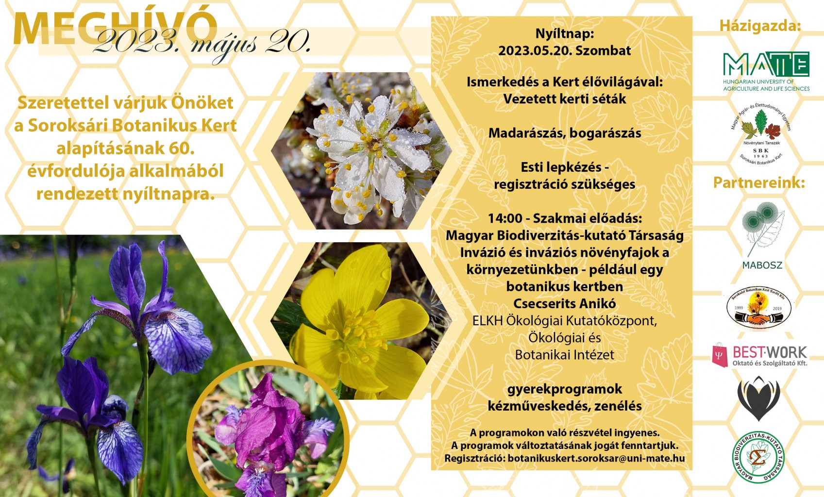 Nyílt nap részletes programja Kertünk a nyílt napon hosszabbított nyitvatartással várja a látogatókat 9 és 17 óra között Programjaink: Kézműves program a Botanikus Kert lenti előadó teremében 10 órától 16 óráig. Zenélés, éneklés a Főépülettel szemben a mezőn gyerekdalokkal, szintén 10 órától. Szakvezetés 4 alkalommal, regisztráció szükséges a botanikuskert.soroksar@uni-mate.hu email címen. A hallhatóság érdekében maximum 40 fős csoportok tudnak részt venni. A szakvezetések 1,5-2 óra hosszúak 10,11, 14 és 15 órakor indulnak Madárles 10 órától, vezetett séta. Szakmai előadás 14 órától a Kert főépület (jobboldali folyosó bal utolsó ajtó), hátsó termében kerül megtartásra. Az előadás témája: Magyar Biodiverzitás-kutató Társaság Invázió és inváziós növényfajok a környezetünkben – például egy botanikus kertben Csecserits Anikó ELKH Ökológiai Kutatóközpont, Ökológiai és Botanikai Intézet Lepkézés/lámpázás napnyugtakor 20 órától kezdődik és 11 óráig tart, 2 helyszínen. Az első a főépülettel szemben, a második helyszín a lenti épület előtt. (Regisztráció szükséges botanikuskert.soroksar@uni-mate.hu email címen, maximum 50 fő) Kérjük Önöket, hogy az esti programnál a két helyszínt ne hagyják el, csak a kettő között mozogjanak, ne sétáljanak szabadon a Kertben! A Kert területén található mosdó, viszont büfé nincs! A sok kullancsra és szúnyogra való tekintettel kérjük gondoskodjanak a megfelelő ruházatról illetve védelemről! A program változtatásának jogát fenntartjuk!