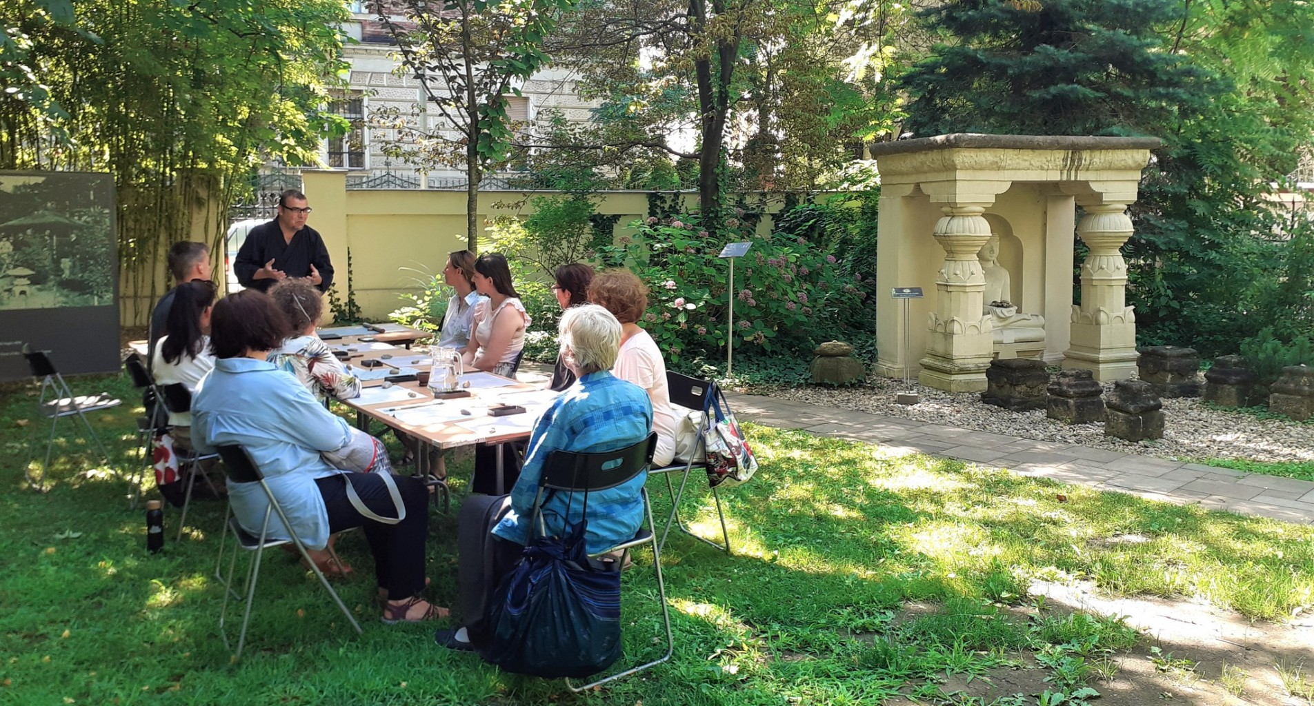 A program rövid, ám intenzív szellemi és gyakorlati bevezetést nyújt a japán művészetekbe. A foglalkozáson az érdeklődők speciális eszközök révén ismerkedhetnek meg a tusfestéssel, a kalligráfiával, a japán bambuszfuvolával, a kert- és harcművészettel: mindegyikkel egy-egy mozdulat erejéig. E művészetek, vagy még inkább "utak" (japánul: dó) elsajátítása azonban igen nagy kihívás elé állítja a nyugati kultúrában élő tanítványokat. A legfőbb nehézséget az jelenti, hogy e művészetek nem az eredményre, azaz a műalkotásra helyezik a hangsúlyt, hanem a műalkotás létrehozásának folyamatára, vagyis a gesztusra, a mozdulatra. Nem az a lényeg tehát, hogy valami úgy nézzen ki, mint a japán művészet remekei, hanem, hogy megvalósuljon az a belső attitűd, amellyel azokat létrehozzák, még ha nem is úgy néz ki az eredmény. Előzetesen erről pedig csak ennyit: a kulcs a mozdulatban rejlik, így akár egyetlen gesztus is elegendő lehet ahhoz, hogy valaki elinduljon az úton.A programon max. 12 fő jelentkezését tudjuk fogadni.