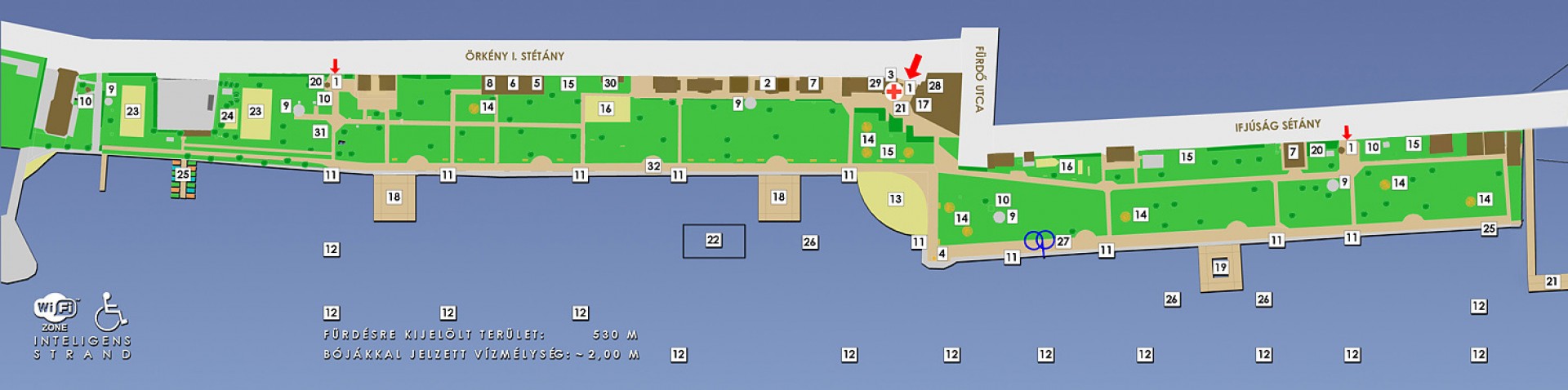 Díjtalan szolgáltatásaink: ingyenes parkolási lehetőség, csúszda használata, ugrálóvár használata, animációs programok, elsősegélynyújtás, vízimentő-szolgálat, közös öltözők, hidegvizes szabadtéri zuhanyzók, WC használat, szélessávú, biztonságos vendég WiFi hálózat, mobiltelefonok, tabletek és okos eszközök töltésének lehetősége, kerékpáros szervizpont, elektromos kerékpárok töltésének lehetősége, árnyékolt kerékpár tárolóban (230V csatlakozópont biztosításával), családi ingyenes WC