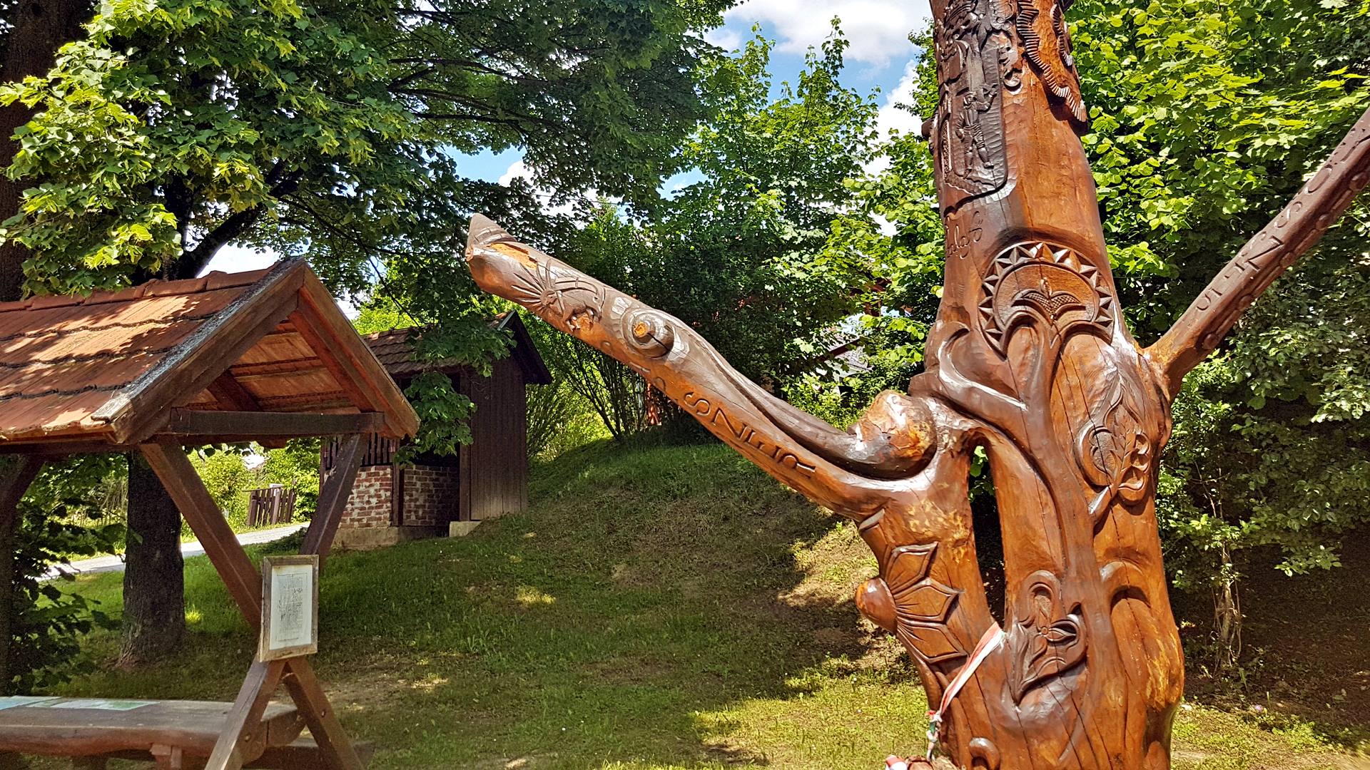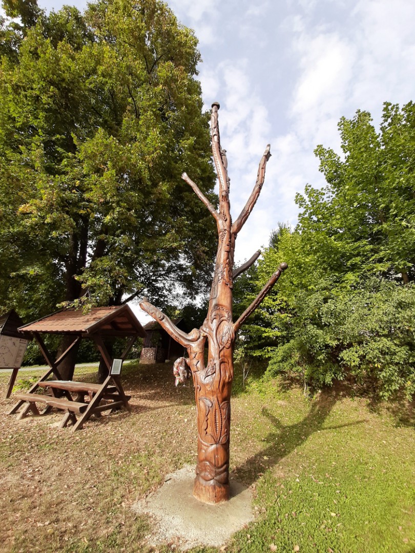 "Az alapanyagul szolgáló, mintegy 8 méteres tölgyfára a Szala-patak partján leltek rá a helyiek. "A fának éppen hét ága van annyi ahány szere a településnek-, s a fát úgy lehet betájolni, hogy az ágak pont a szerek irányába mutassanak. Az Életfa kifaragására Lugosi Arnold polgármester Milkovics Jenő baranyai fafaragót kérte fel.”