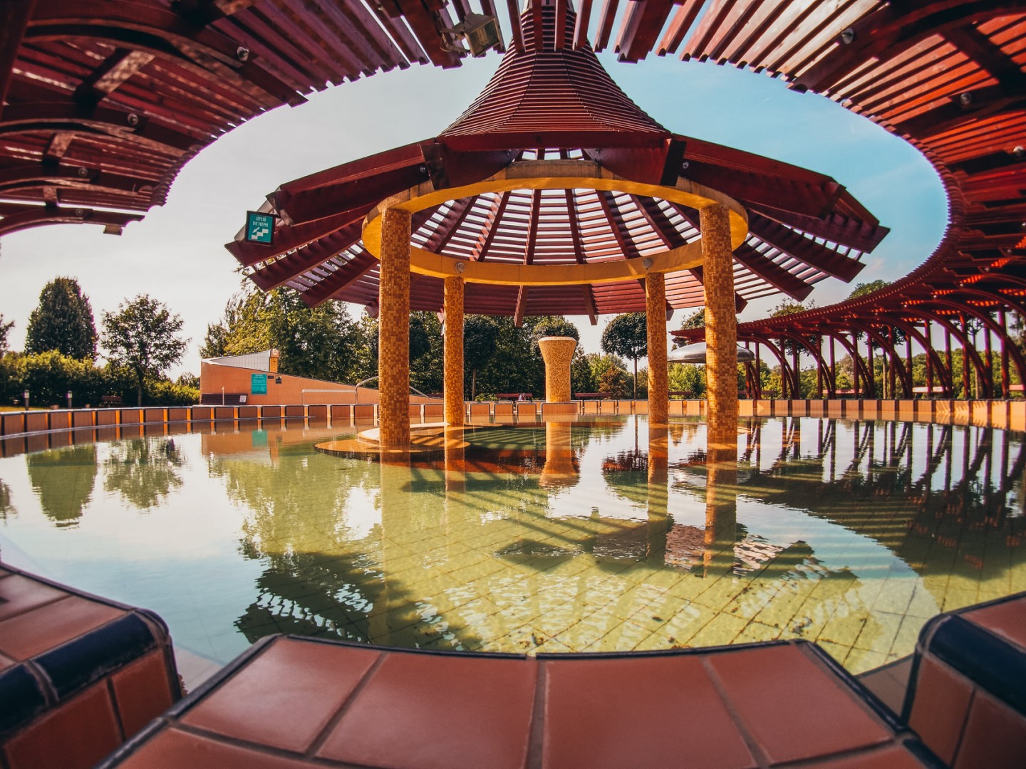 A virágokkal és dísznövényekkel teli, szezonálisan üzemelő strandon ideális kikapcsolódást biztosító napozó területek, gyógy- és termálvizes medencék, sportpályák és gyermekjátszótér várja a látogatókat.