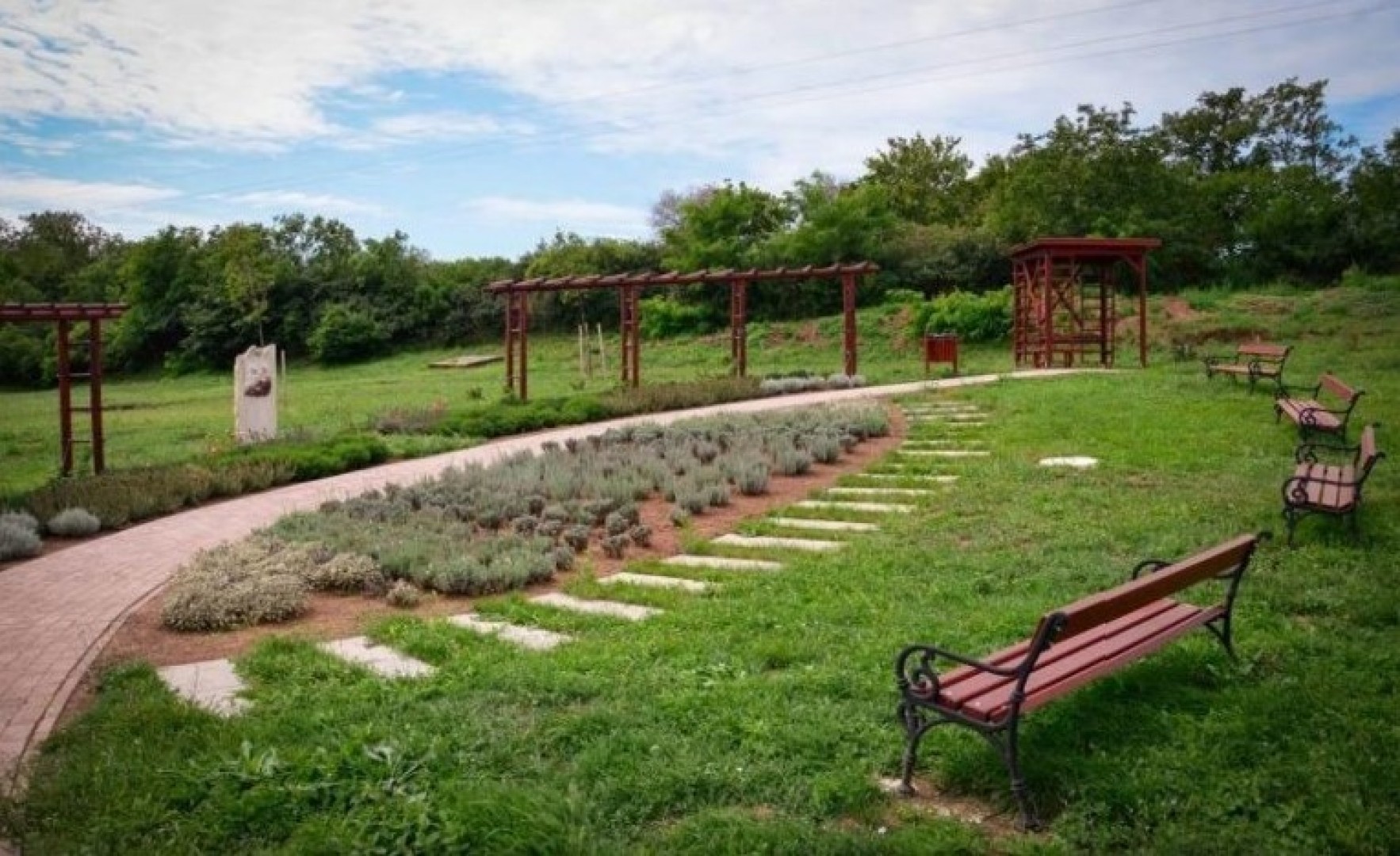 A gyógynövényes kert előtt található padokat tipegősoron keresztül közelíthetik meg a látogatók. A pihenést és elmélkedést szolgálják. A közösségi tér és játszótér a terület középvonalában került elhelyezésre, szalonnasütővel, asztalokkal, padokkal, fa játékokkal. A területen egy fedett kerti építmény - zarándokpihenő is helyet kapott, ennek elsődleges funkciója az eső elleni védelem, burkolata fűrészelt kőburkolat. A telepített fák és cserjék ligetes-laza elrendezésben helyezkednek el a területen. Az ivókút használatával a látogatók friss ivóvizet tudnak vételezni.
