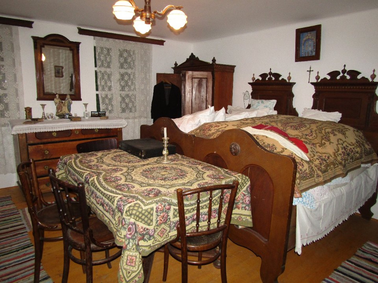 A tisztaszoba, vagy első szoba nem fűthető, és csak különleges alkalmakkor használták (esküvő, keresztelő, ritka vendégek, ravatalozás). A bútorzata is a legszebb. Az ágyak feletti kis szekrénykében őrzik a menyasszonyi koszorút. A ház minden helyiségében láthatjuk a vallási relikviákat, mindenütt jelen vannak a szentképek, imakönyvek, szenteltvíztartók. A díszes szekrényekben az ünneplős férfi és női ruhák kaptak helyet. A sublótban őrzik azokat a textíliákat, amelyeket hétköznap és ünnepnap viseltek, a hímzési mintakendőket, melyeket a lányok még az iskolában készítettek. A népviseletbe öltöztetett babák a különböző korosztályok hétköznapi és ünnepi viseletét mutatják be. A menyasszony mindig díszes fekete ruhában ment férjhez.