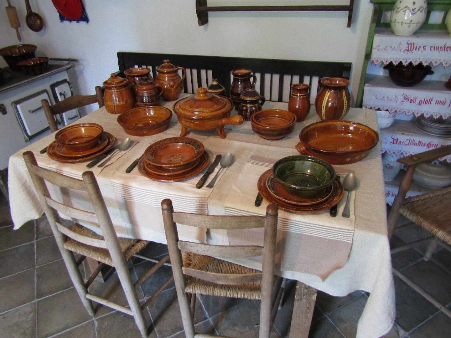 A lakókonyhában élte a család az életét. Ez az egyetlen helyiség, amit fűtöttek. A konyhában az asztalfőn ült a családfő, legtöbbször a nagypapa. A székének a neve is erre utal: a gondoskodó széke – Sorgestuhl. A konyhai edényeket két forrásból szerezték be: a cserépedények az óbányai fazekasoktól, az újabb kori zománcedények a bonyhádi zománcgyárból származnak. Már régen is gondoskodtak a szellőztetésről, páraelszívásról – a kályha felett a mennyezetbe vágott kis nyílás a padlás felé szellőzött. A konyha egyik sarkában kapott helyet az egykori fürdőszoba. A vizet természetesen az udvari kerekes kútból nyerték. Említésre érdemesek a hímzett és feliratos törölközők, falvédők.