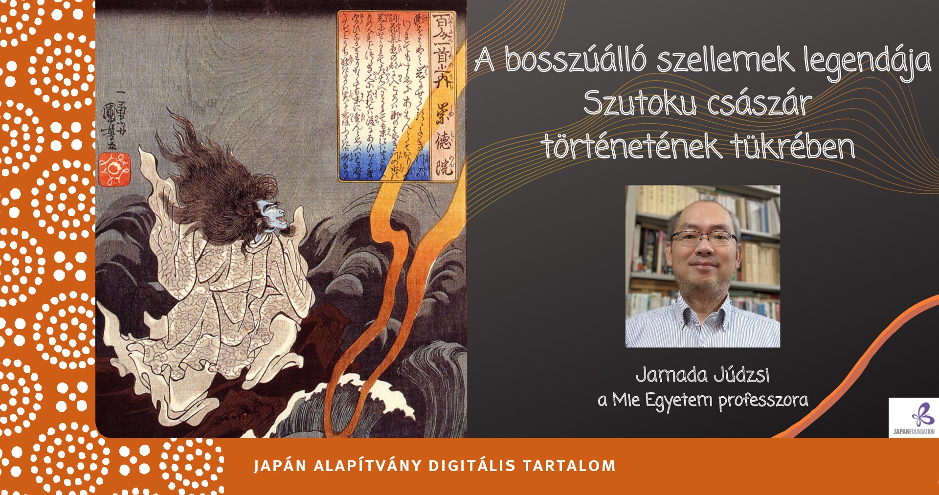 Előadásában Jamada professzor beszél a bosszúálló szellemek történelmi vonatkozásairól, illetve a velük kapcsolatos különféle nézőpontokról és hiedelmekről. A webinárium moderátora dr. Lázár Marianna, a Károli Gáspár Református Egyetem japán szakának oktatója, az előadás pedig japán nyelven, magyar tolmácsolással zajlik.