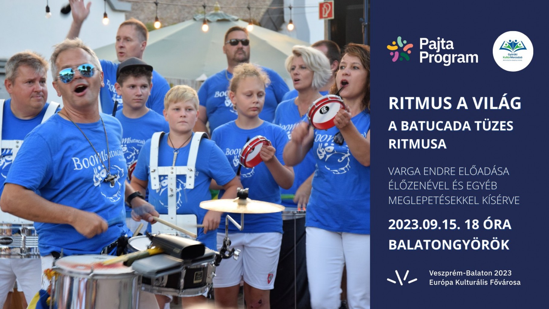 A világ számtalan lüktető ritmus otthona, ezek közt segít elkalauzolni ez az interaktív előadássorozat, melynek házigazdája Varga Endre fuvolaművész. Az előadások során élőzenei betétek, tánc és alkalomadtán közös dobolás is kíséri a programokat, melyben zenésztársak is közreműködnek. Szeptember 15-én Balogh György, a Ritmo 2003 Batucada Band vezetője ismerteti meg a közönséget a batucada műfajjal. Közreműködik Gombos László, a keszthelyi Boombatucada ütőegyüttes vezetője.A batucada a brazil tradicionális ütőhangszerek műfaja, amelynek ritmikus mintázata a szamba egyik műfajává teszi. A "batucada" szót használják e zenei műfajt gyakorló zenészek csoportjának jelölésére is. A keszthelyi Boombatucada a környék közismert és kedvelt dobegyüttese.A Pajta Program eseményei a Veszprém-Balaton 2023 Európa Kulturális Fővárosa program részeként valósulnak meg.