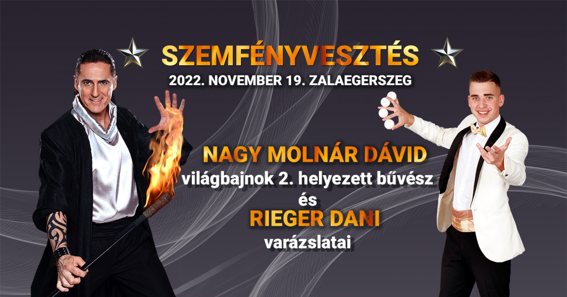 Nagy Molnár Dávid világbajnok 2. helyezett bűvész és Rieger Dani bemutatja a SZEMFÉNYVESZTÉS című előadássorozat soron következő műsorát Zalaegerszegen. Látványos illúziók, gondolatolvasás és további humoros, szórakoztató mutatványok egy színpadon.